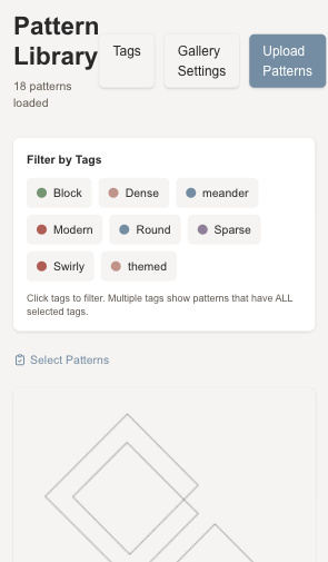 Upload your pattern files, tag and organize your patterns, preview how they tile across a quilt, and share a beautiful gallery with clients — no website required.