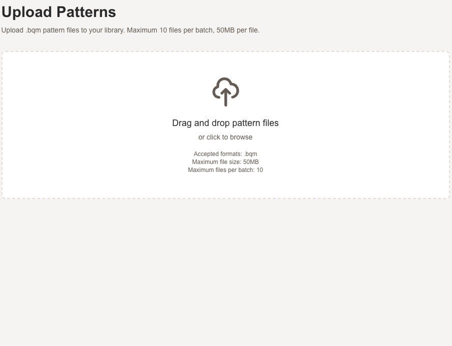 Drop your pattern files directly into the library. We generate a clean preview automatically — no screenshotting required.